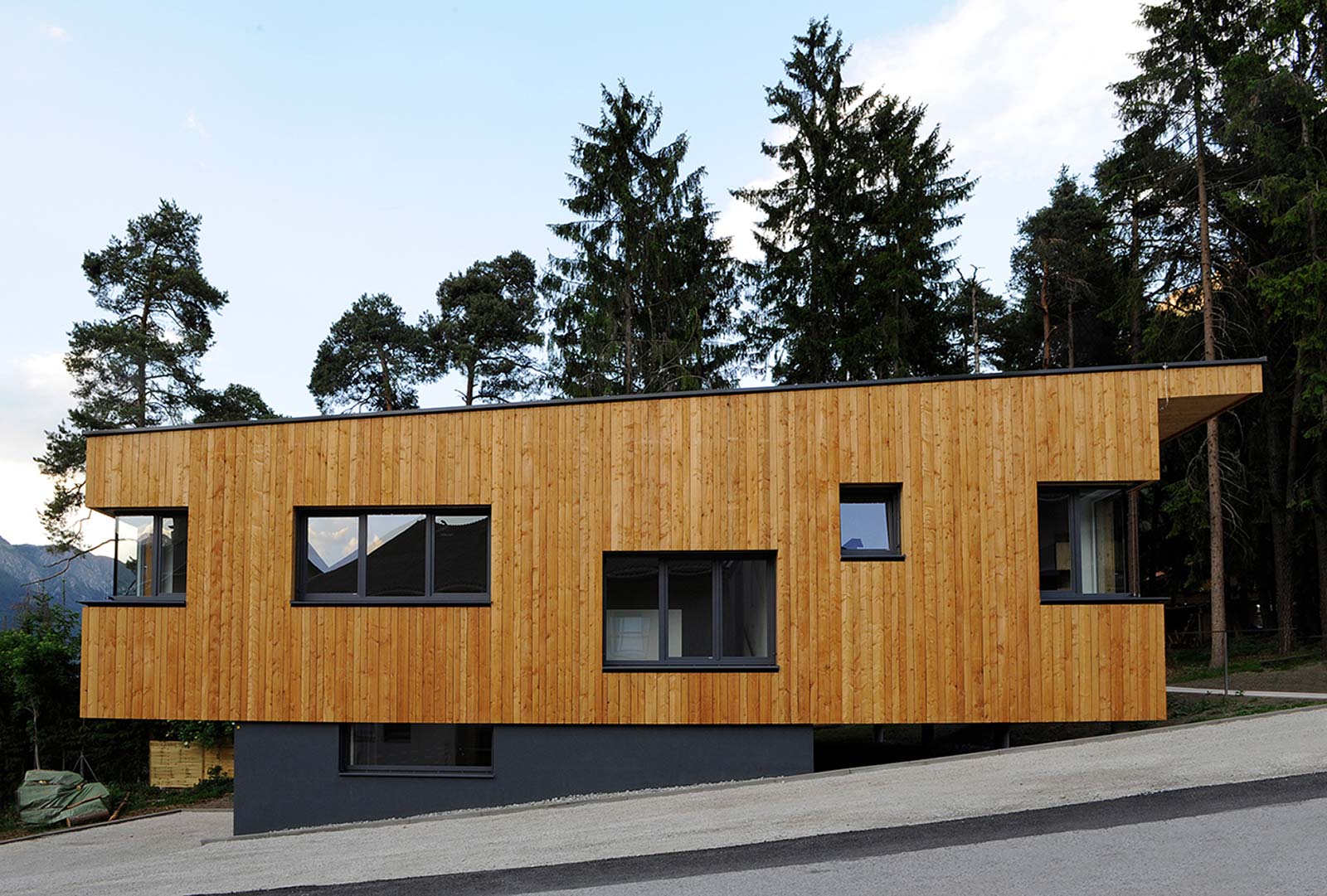 Die naturbelassenen Materialien (Lärche sägerauh unbehandelt, Corten-Stahl, Betonsäulen, -rampe und -brücke) unterstreichen die Idee des Stadels wie auch den geringfügigen baulichen Einschnitt in das Gelände. Der Waldboden fließt unter dem Gebäude hindurch. Als bewussten Eintritt in das Gebäude fungiert die „Windfangbrücke“. Um die Intimität des Kunden im Inneren des Gebäudes zu gewährleisten, wurden die Therapieräume in Richtung Wald situiert und weiters die Fensteröffnungen höher als sonst üblich angebracht.